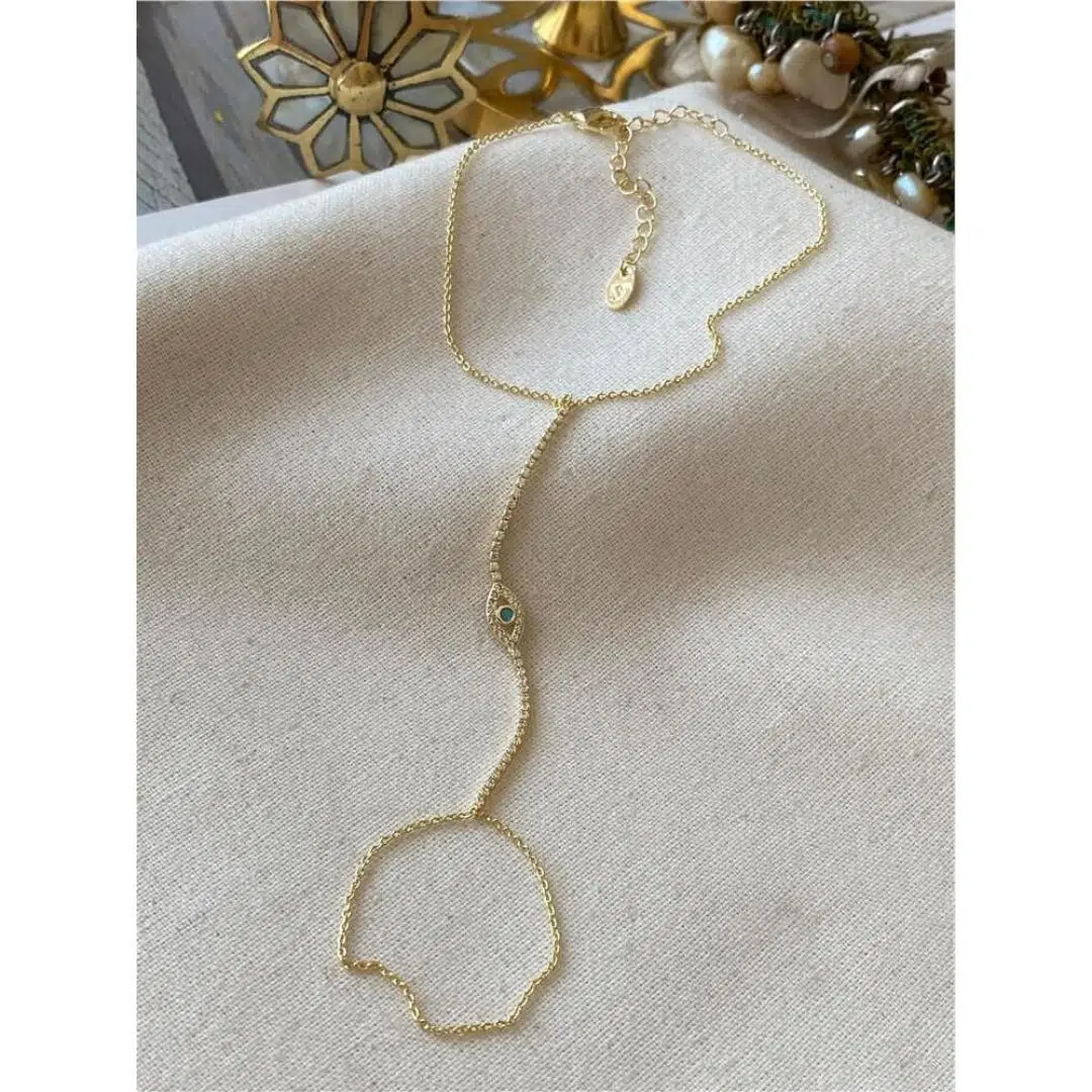 Zarafeti ve modern şıklığı bir araya getiren altın renk paslanmaz çelik şahmeran bileklik, göz alıcı tasarımıyla stilinizi tamamlar. El üstünden bileğe uzanan ince zincir yapısı, ortasında yer alan nazar figürlü detay ile hem estetik hem de anlamlı bir görünüm sunar.