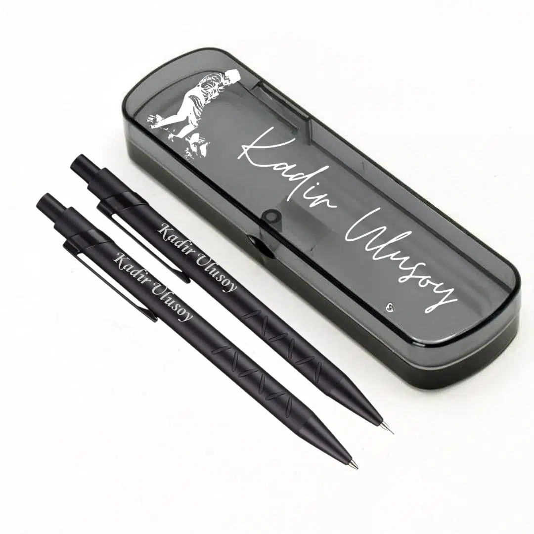 Set İçeriği: 1 adet tükenmez kalem, 1 adet uçlu kurşun kalem, 1 adet kişiye özel baskılı kutu