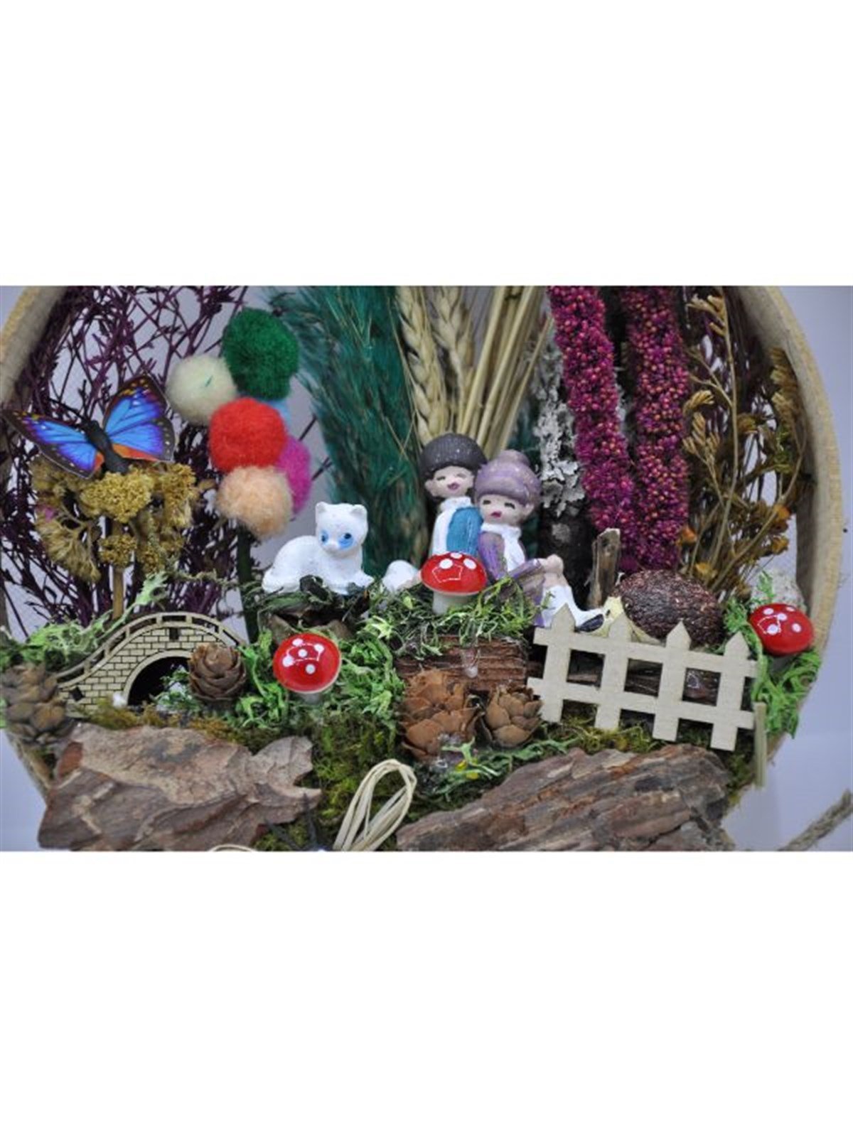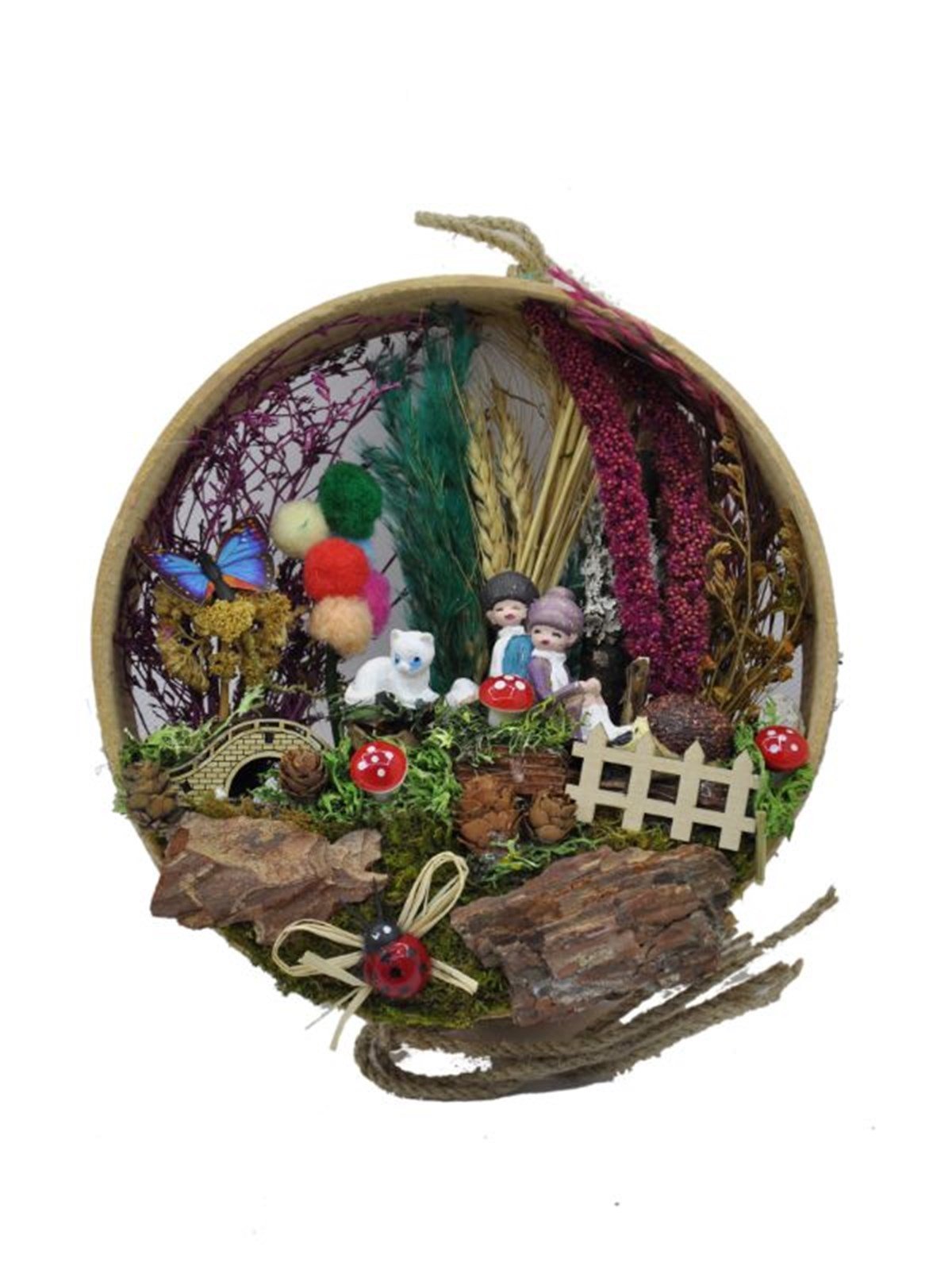 çit,gelincik,mantar figürleri kozalak,şoklanmış yosun,taş,ağaç kabukları,kurutulmuş bitkiler ve jut ip kullanılmıştır.Bereket sembolü elek içerisinde tasarlanmış ürünümüz,ev-ofis ortamı için ideal olup,bakım gerektirmez