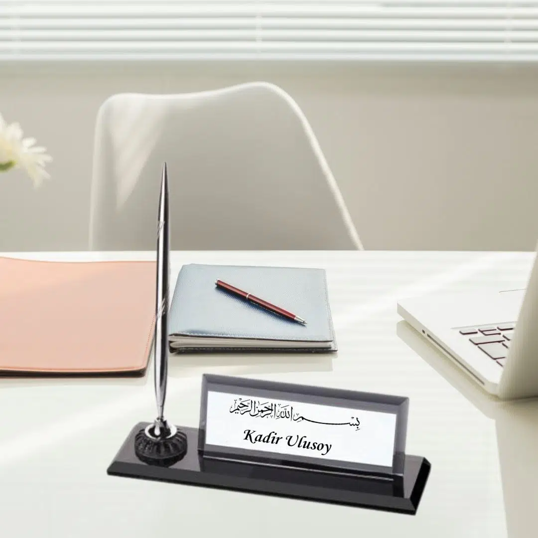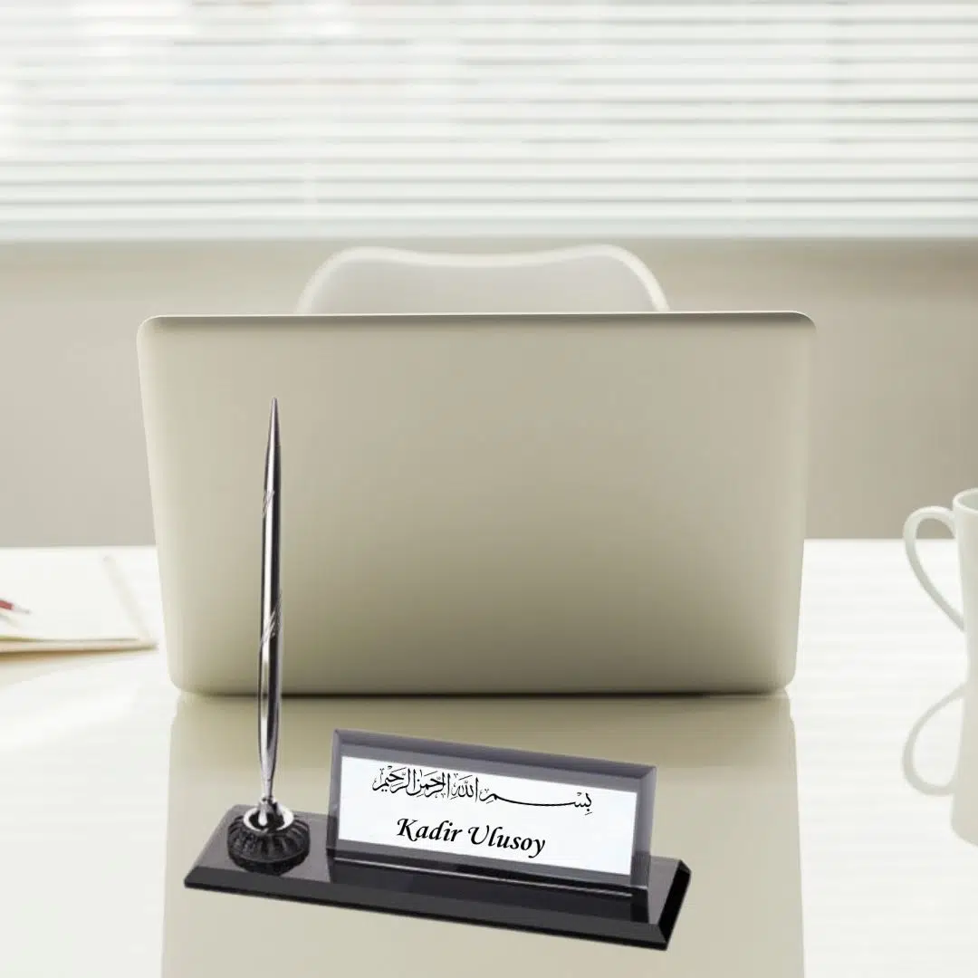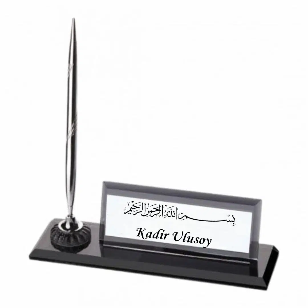 İnce işçilikle hazırlanmış bu Besmele yazılı masa üstü isimlik, hem manevi değer taşıyan bir dekoratif ürün hem de kişisel bir çalışma alanı aksesuarıdır. Kristal zemin üzerine işlenmiş "Bismillahirrahmanirrahim" hat yazısı ve kişiye özel isim detayı, zarif tasarımıyla ön plana çıkar. Yanında yer alan paslanmaz metal kalem ile hem estetik hem de işlevsellik sunar.