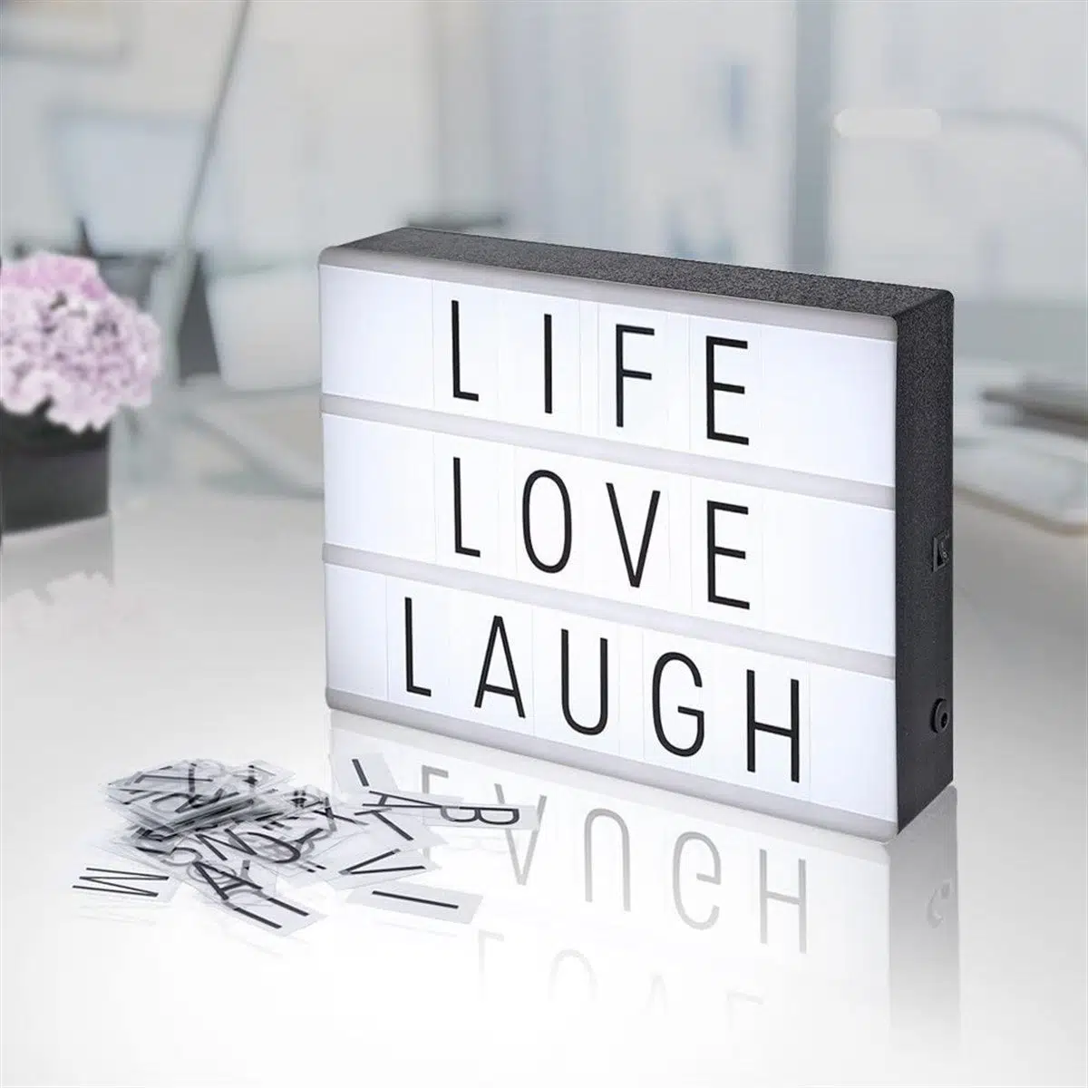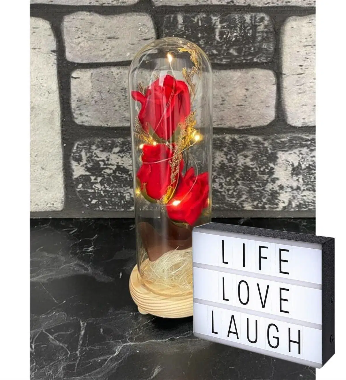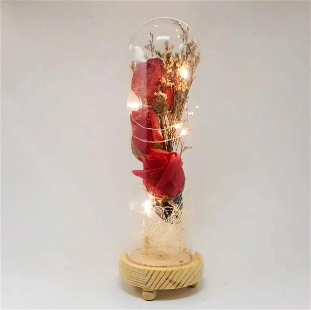 Cam Fanus İçinde Işıklı Kırmızı 3 Gül ve Orta Boy Light Box 96 Harfli