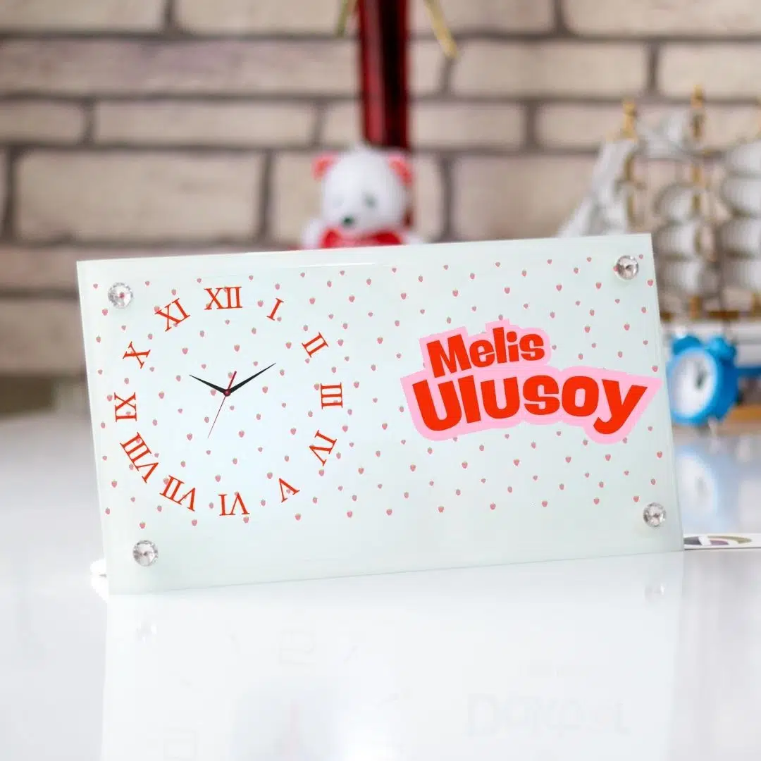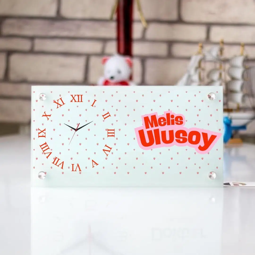 Çilek Desenli Kişiye Özel Cam Masa Saati – İsim Yazılı Masaüstü Dekor Saat