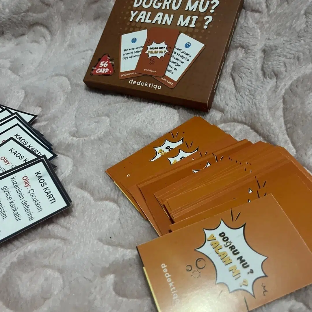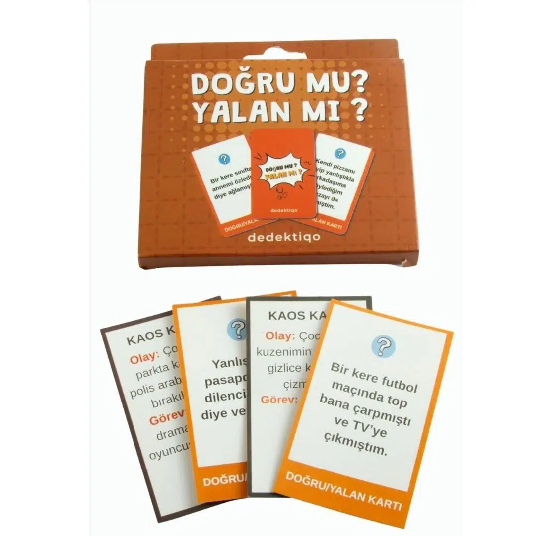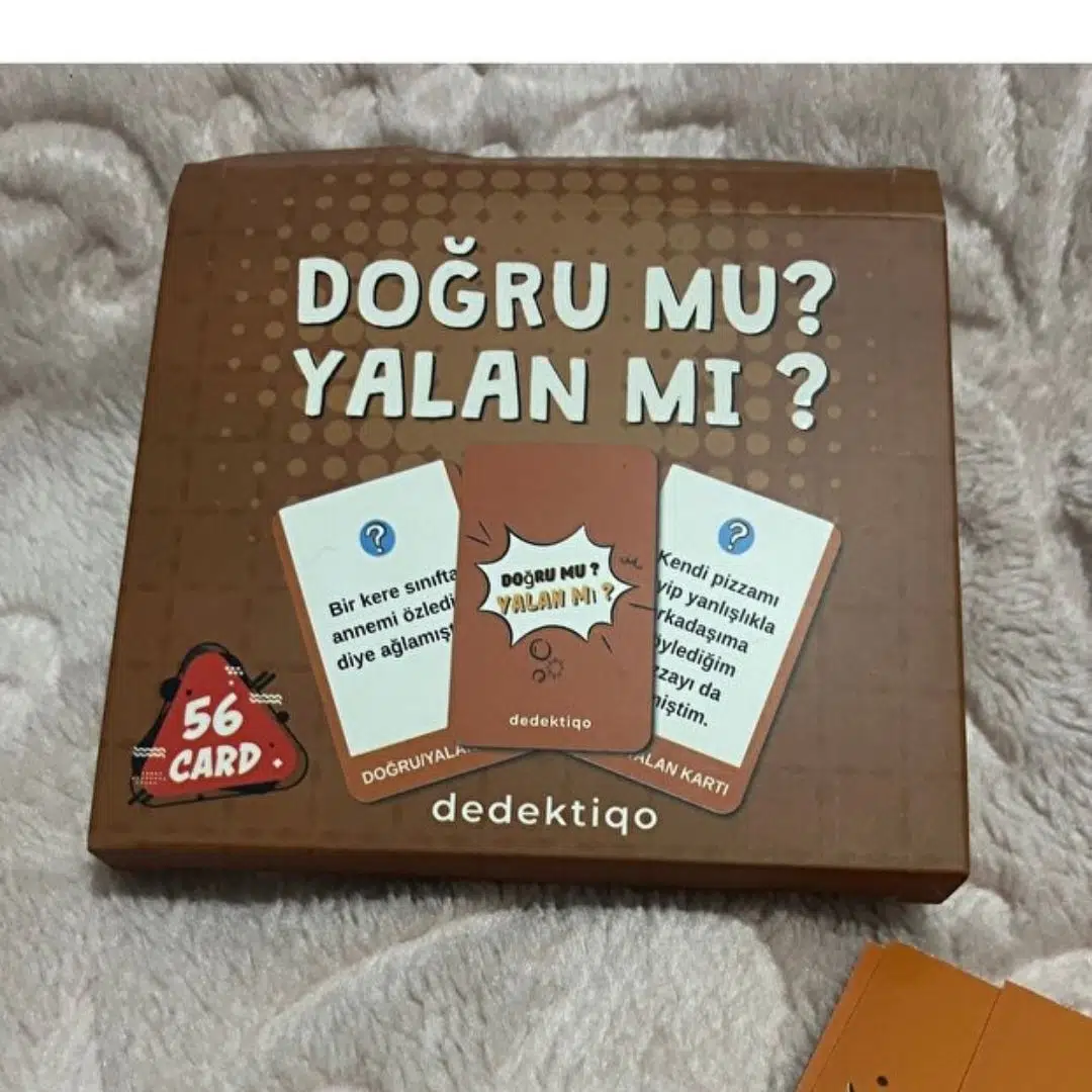 Doğru mu? Yalan mı? Kutu Oyunu, arkadaşlarınızla ve ailenizle keyifli vakit geçirmenizi sağlayan eğlenceli ve interaktif bir sohbet oyunudur. Kartlar üzerinde yer alan sorular ve tahminler sayesinde hem kahkaha dolu anlar yaşanır hem de oyuncular birbirlerini daha yakından tanıma fırsatı bulur.