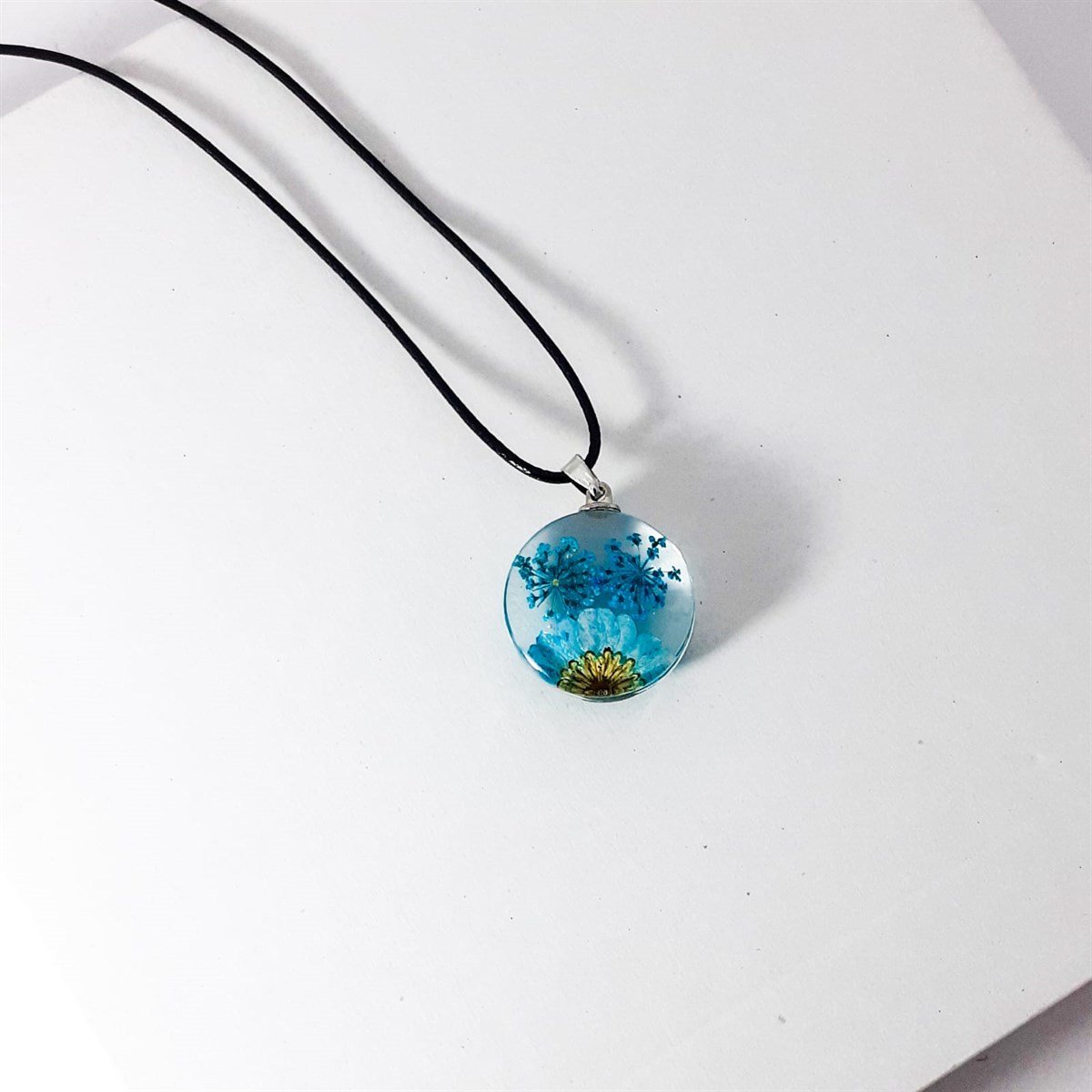 Kolye, canlı çiçeklerin kurutulması yöntemiyle el yapımı olarak hazırlanmıştır.