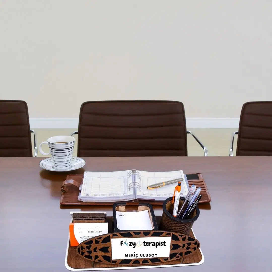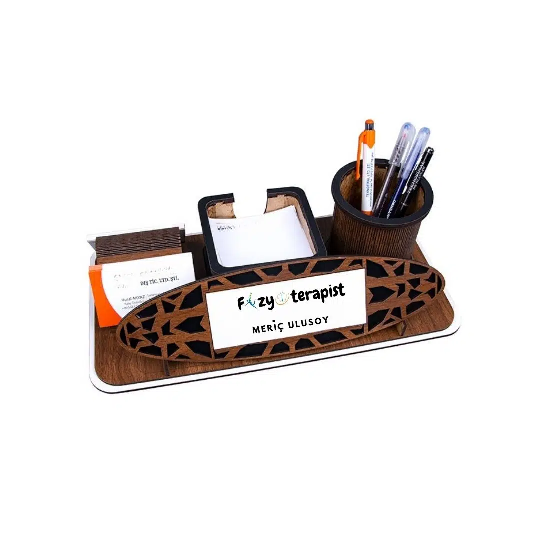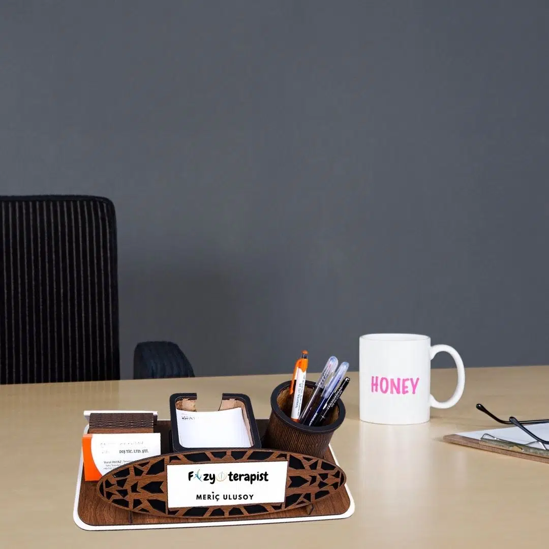 Kalemlik, kartvizitlik ve notluk bölmeleri sayesinde düzenli bir masa ortamı sunan bu özel tasarım, üzerine fizyoterapist ismi ve unvanı eklenerek tamamen kişiye özel hale getirilir. Mesleki kimliği yansıtan bu anlamlı masa üstü isimlik, hem ofiste şıklık yaratır hem de sevdiklerinizi mutlu eder.