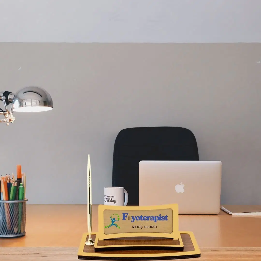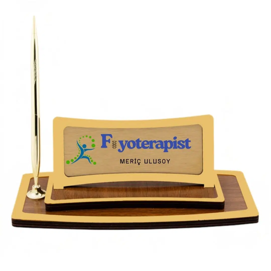 Fizyoterapistlere özel olarak tasarlanan bu zarif masa isimliği, kişiye özel isim ve unvan bilgisiyle hazırlanarak profesyonel bir görünüm sunar. Altın renkli kalemi ve ahşap tabanlı şık yapısıyla hem modern hem de klasik ofis dekorasyonlarına mükemmel uyum sağlar.