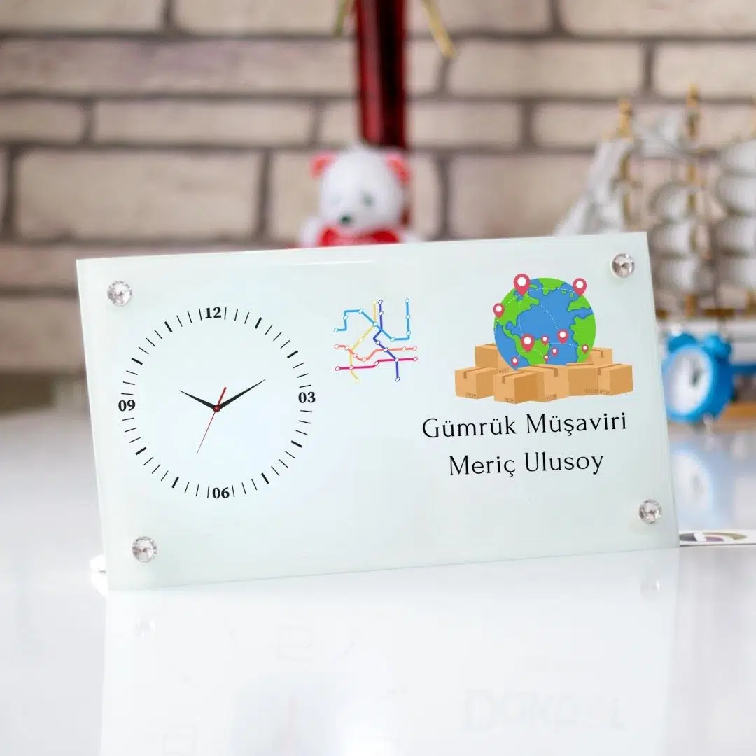 Gümrük Müşavirine Özel Cam Masa Saati – İsim Yazılı Kurumsal Masaüstü Ofis Saati