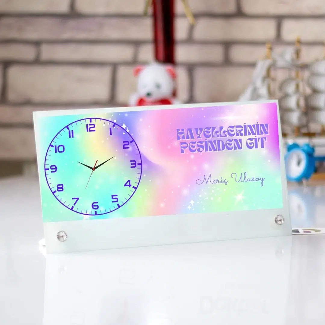 Hayallerinin Peşinden Git Temalı Kişiye Özel Cam Masa Saati – Motivasyon Sözlü Masaüstü Saat