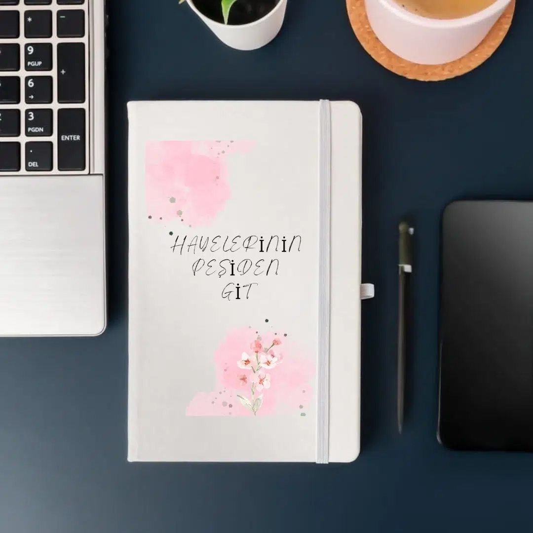 Hayallerinin Peşinden Git Yazılı Çiçek Desenli Kişiye Özel Deri Kapak Defter