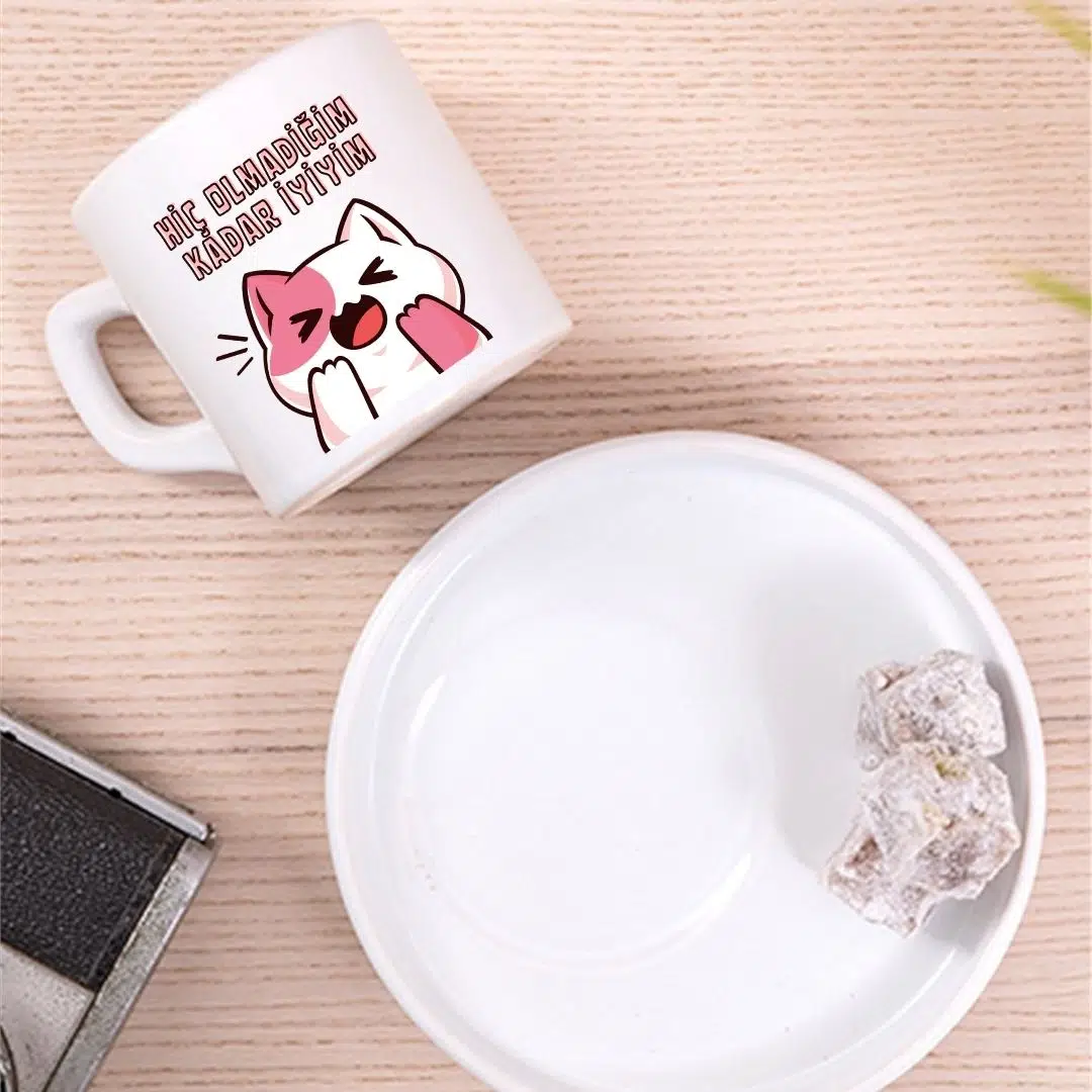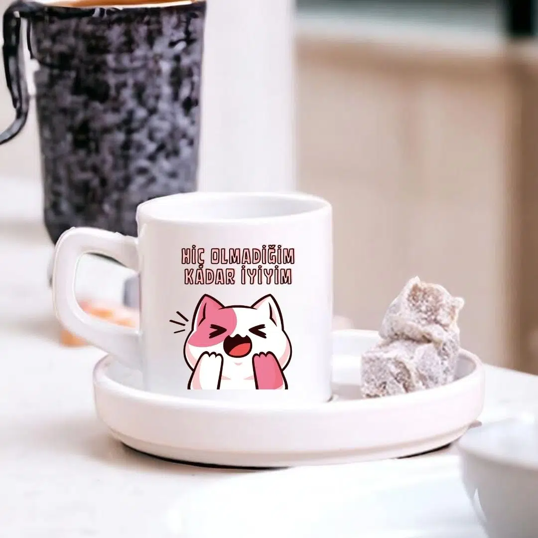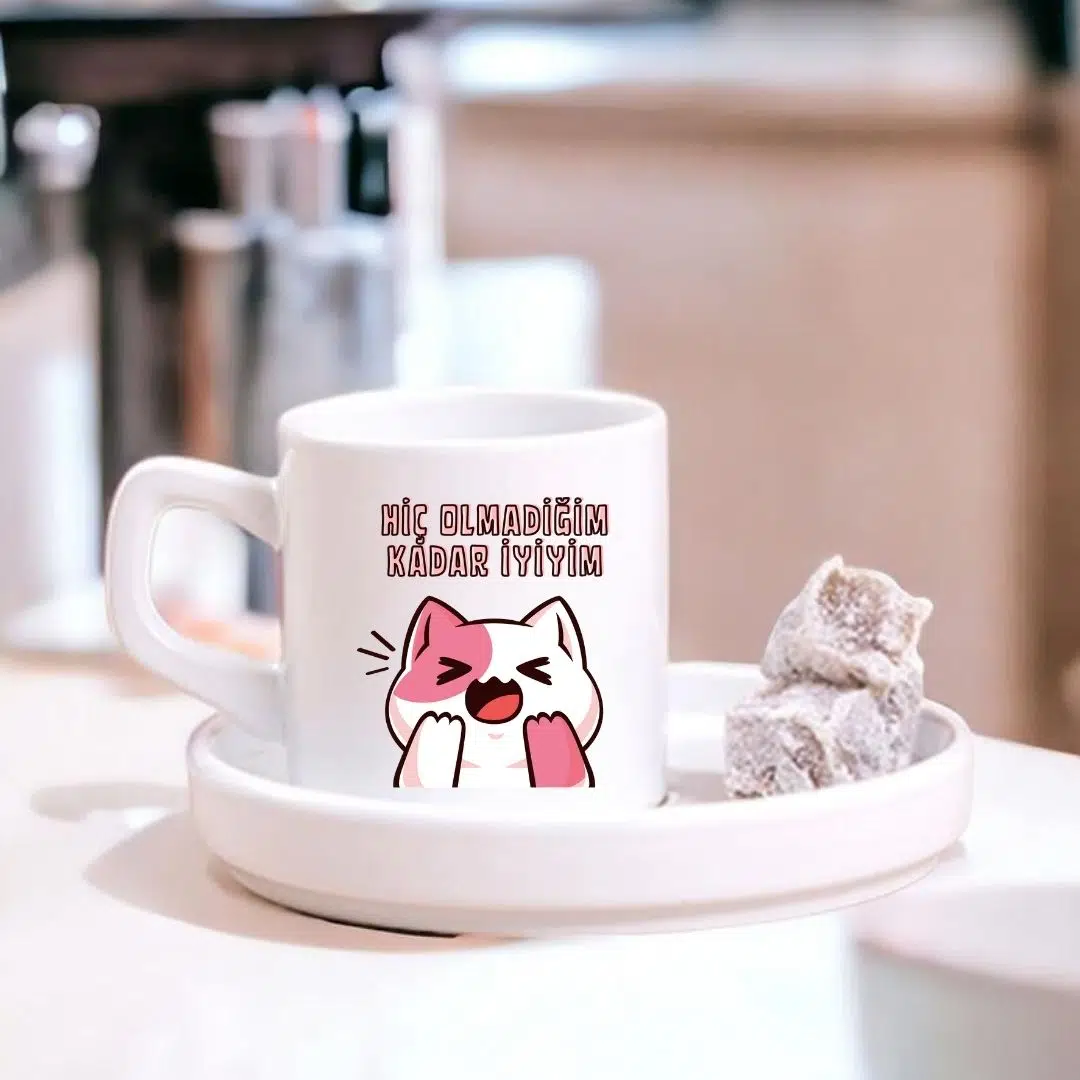“Hiç Olmadığım Kadar İyiyim Tasarımlı Sevimli Kedi Türk Kahve Fincanı – Hediyelik Tekli Fincan”