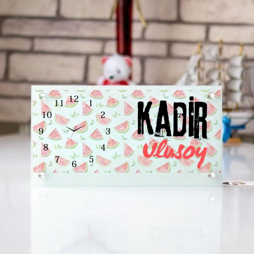 Karpuz Desenli Kişiye Özel Cam Masa Saati – İsim Yazılı Masaüstü Dekor Saat