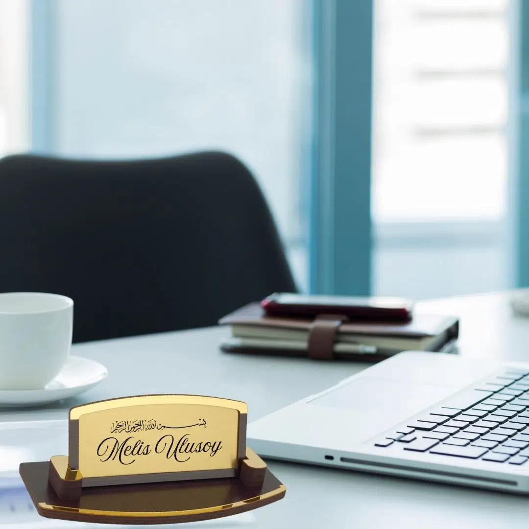 Besmele motifli zarif tasarımıyla öne çıkan bu kişiye özel masa isimliği, ahşap tabanı ve parlak metal plaka detayıyla hem iş ortamlarına hem de ev-ofis dekoruna estetik bir dokunuş katar. İsim ve unvan lazer kazıma tekniğiyle özenle işlenir, böylece uzun yıllar boyunca kalıcı ve net görünümünü korur. Manevi anlamı ve şık görünümü sayesinde özel günlerde, iş yeri açılışlarında veya sevdiklerinize anlamlı bir hediye olarak mükemmel bir tercihtir.