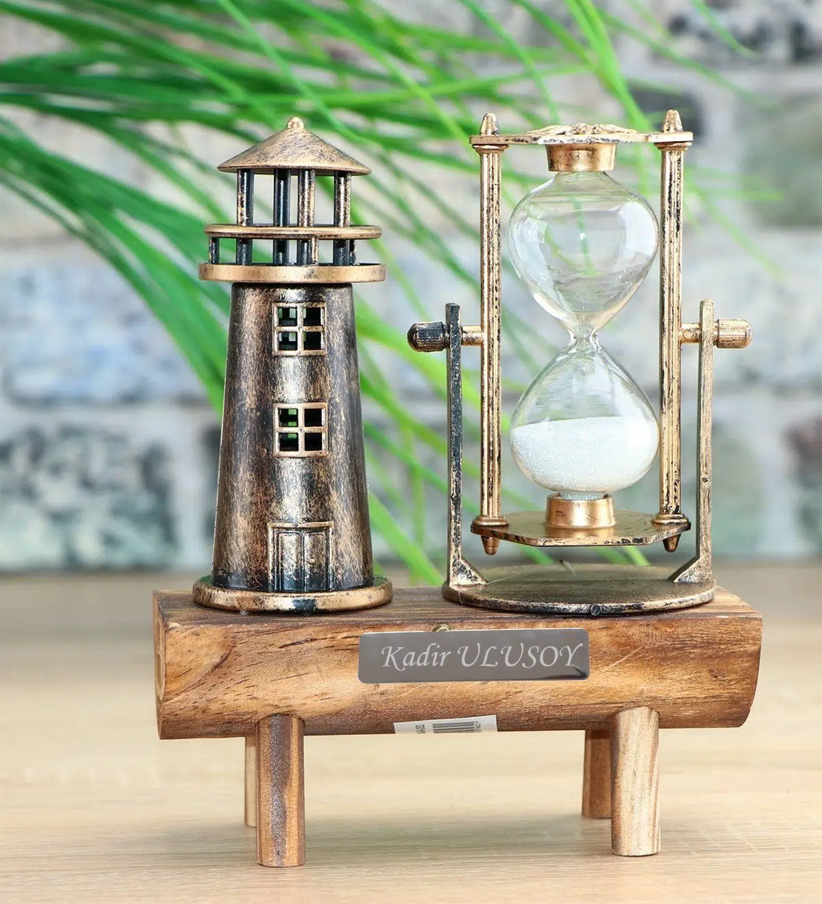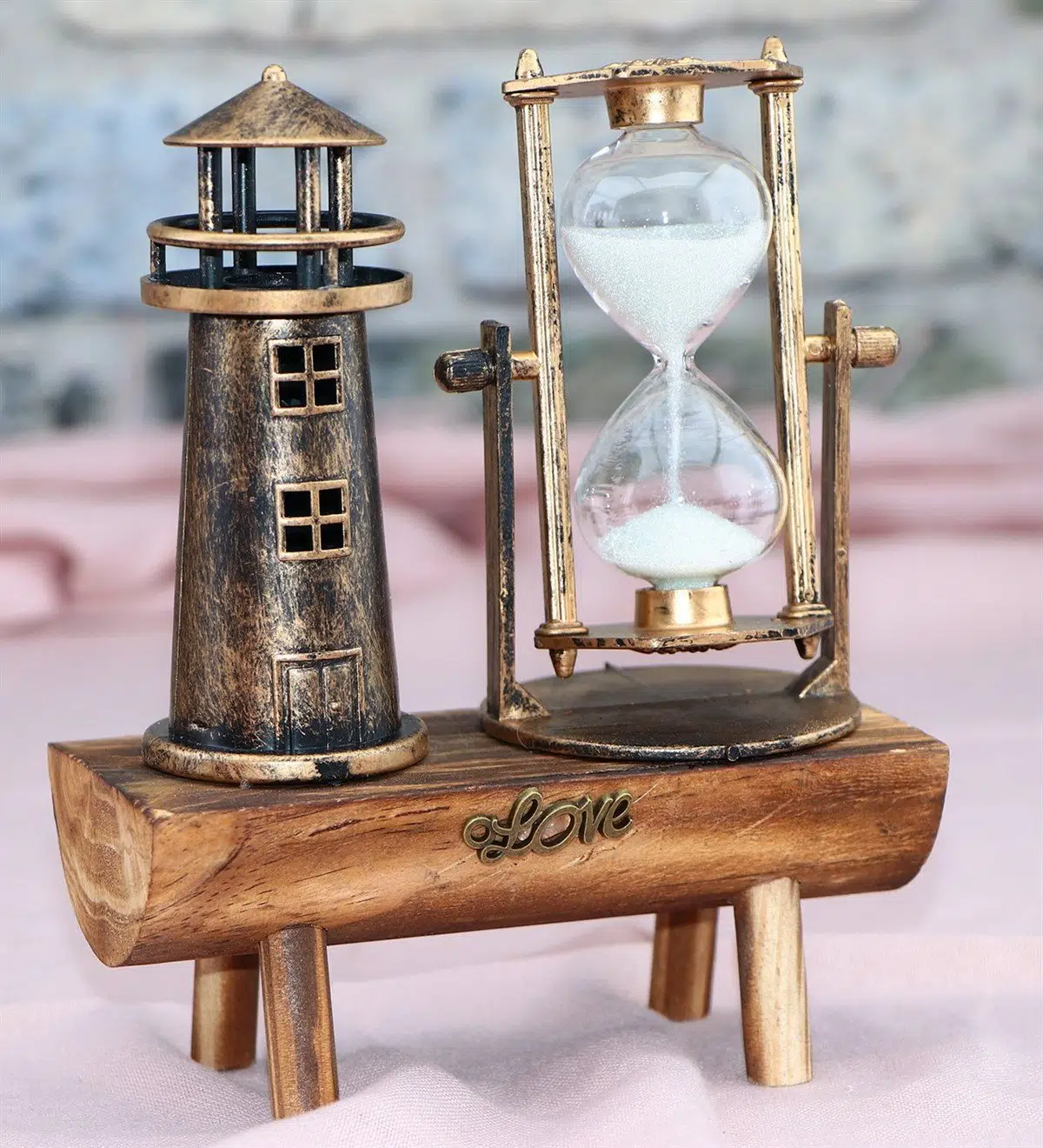 Deniz Feneri değirmenlerinde olduğunuzu hissedip düşündüğünüz zamanlarda yanında ki kum saati ile zamanı yavaşlatmaya ve anın tadını çıkarmaya ne dersiniz Hayatınızda sizi mutlu eden ve mutlu olmayı hak eden tüm sevdikleriniz için... Ürün özellikleri;ahşaptan üretilmiş olup kum saati kısmı mikadır ve orta kısımda love yazmaktadır.ebatlar;en 14,5cm yükseklik 18cm