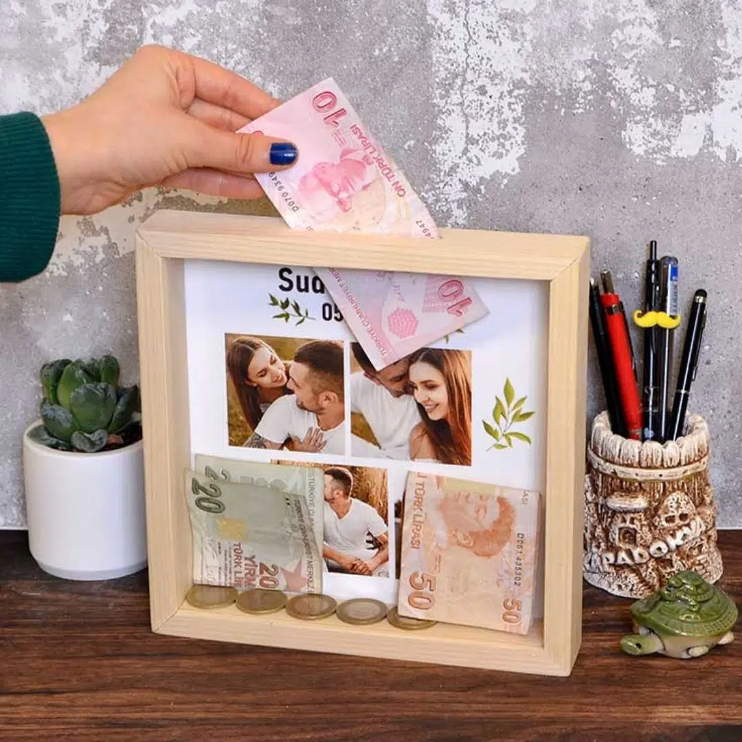 Kişiye özel fotoğraflı ahşap çerçeve kumbara ile hem sevdiklerinizle olan en özel anlarınızı sergileyin, hem de hedeflerinize adım adım birikim yapın! Bu şık ve işlevsel ürün; doğum günü, sevgililer günü, evlilik yıldönümü gibi özel günler için anlamlı ve kullanışlı bir hediye alternatifi sunar. Üzerine dilediğiniz isim, tarih ve fotoğraflarla tamamen size özel hale getirilir.
