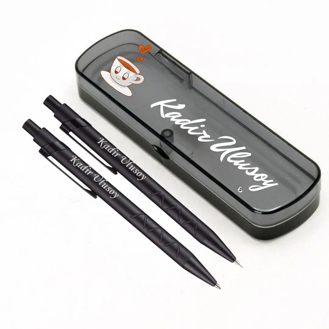 Set İçeriği: 1 adet tükenmez kalem, 1 adet uçlu kurşun kalem, 1 adet kişiye özel baskılı kutu