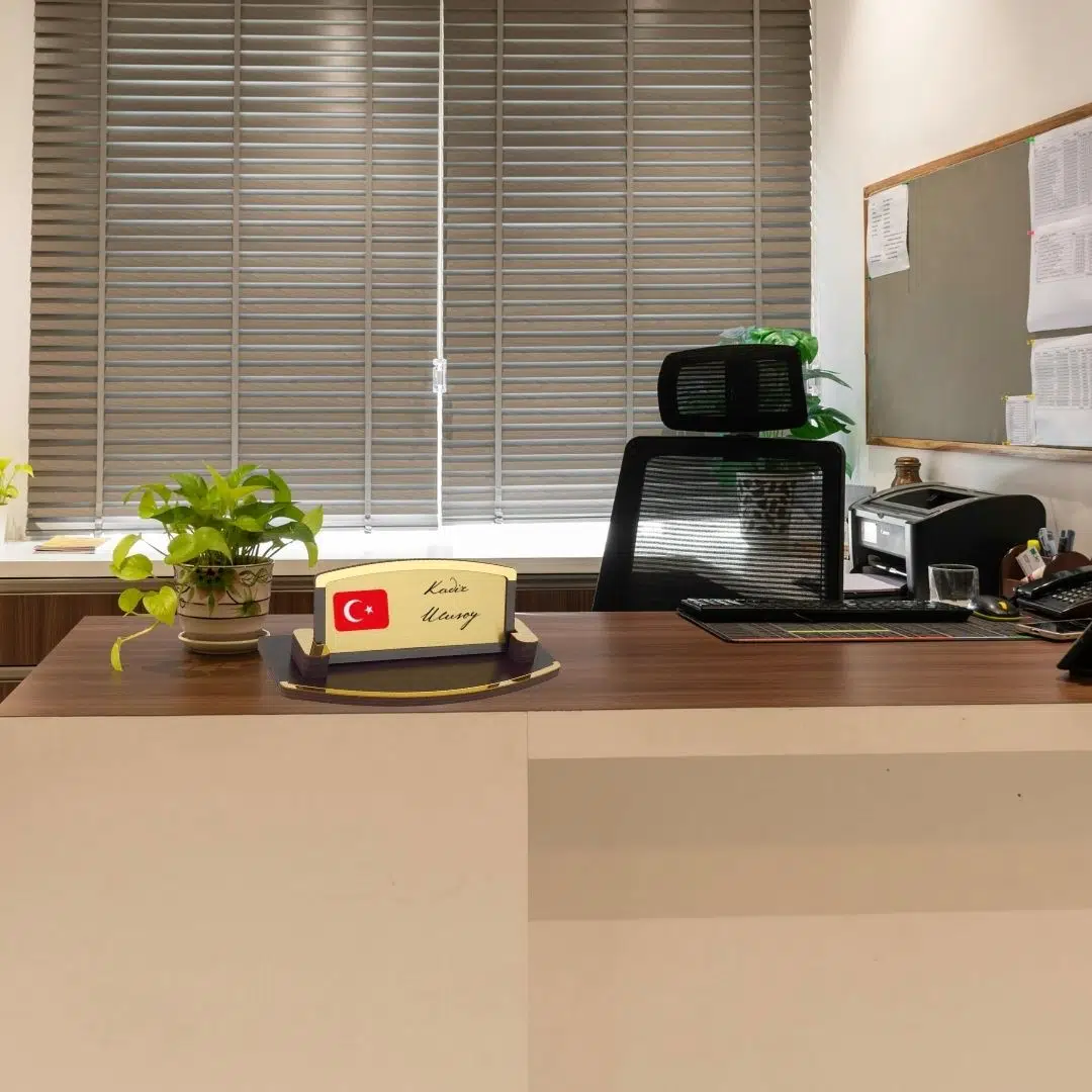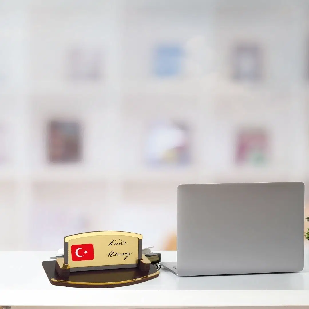 Türk bayrağı detayıyla öne çıkan bu kişiye özel masa isimliği, ahşap tabanı ve metal plaka tasarımıyla ofis, çalışma odası veya makam masalarına şıklık ve prestij katar. İsim ve unvan lazer kazıma tekniğiyle özenle işlenir, böylece uzun yıllar boyunca net ve kalıcı bir görünüm sunar. Vatansever sevdiklerinize anlamlı bir hediye, kurumsal ofisler veya resmi kurumlar için şık bir masa aksesuarı olarak mükemmel bir tercihtir.