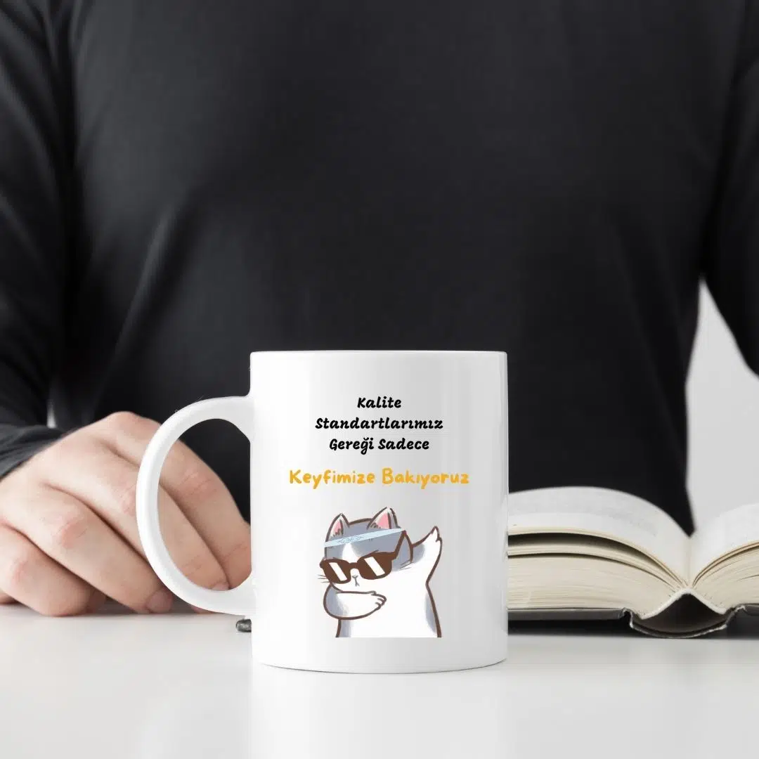 Güne pozitif bir enerjiyle başlamak isteyenler için harika bir seçenek! “Kalite Standartlarımız Gereği Sadece Keyfimize Bakıyoruz” yazılı bu komik kedi tasarımlı kupa, ofiste, evde veya hediye olarak mükemmel bir tercih.
