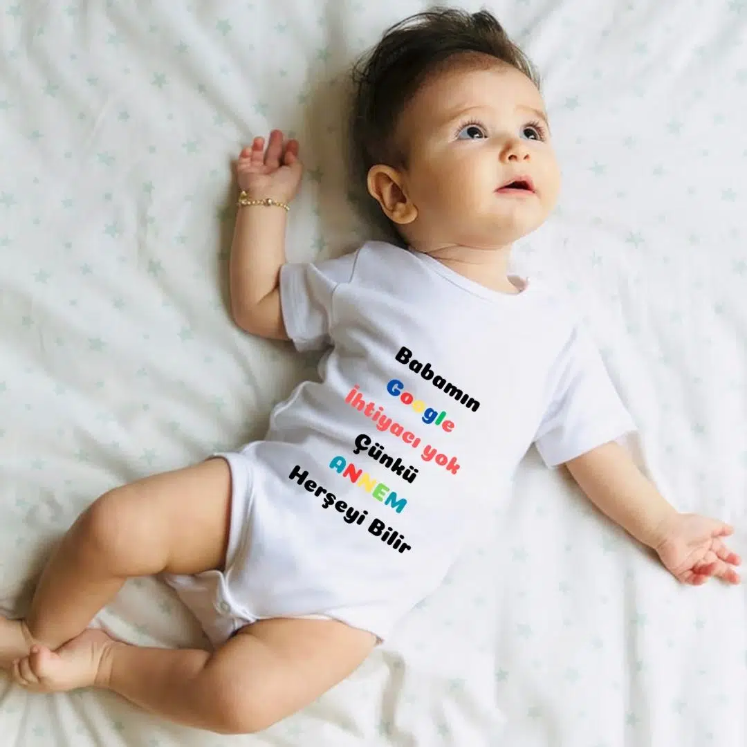 Eğlenceli tasarımıyla dikkat çeken Komik Sözlü Anne Temalı Bebek Zıbını, hem günlük kullanımda hem de özel anlarda bebeğinize şirin bir hava katıyor. “Babamın Google’a İhtiyacı Yok Çünkü Annem Her Şeyi Bilir” yazılı renkli baskısıyla anneye özel esprili bir mesaj taşıyan bu body, annelere hediye etmek için de harika bir seçenek.