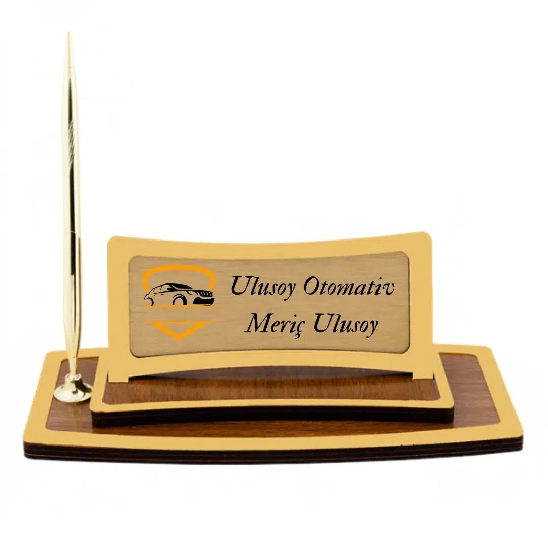 Firmalara özel olarak tasarlanan bu şık masa isimliği, kurumsal logonuzun ön planda yer aldığı profesyonel bir ofis aksesuarıdır. İsim ve unvan bilgileriyle kişiselleştirilebilen bu ürün, ofis ortamına prestijli ve kurumsal bir hava kazandırır. Altın renk detaylara sahip kalemi ve ahşap zeminli yapısı ile hem klasik hem de modern dekorasyonlara uyum sağlar.