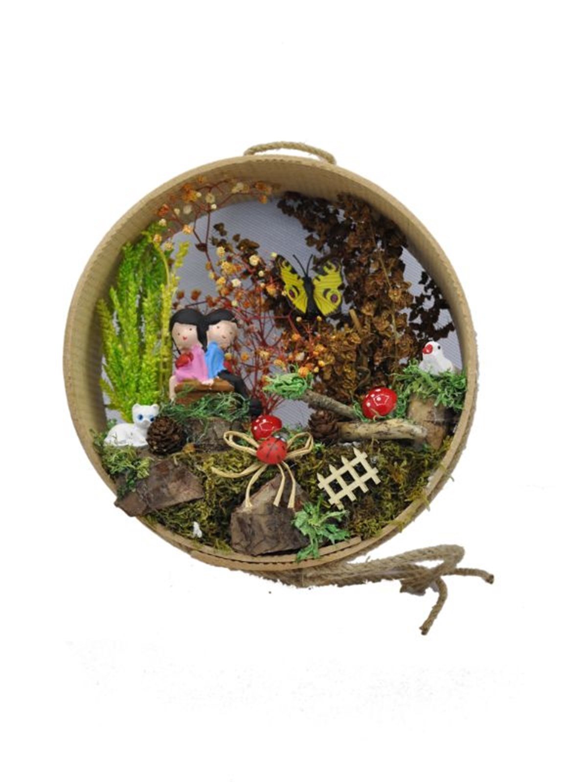 Ahşap Elek içinde içerisinde tasarladığımız bu anlamı çok özel teraryum; beyaz kum, şoklanmış yosunlar, , kurutulmuş bitkiler ve çiçekler, iki çifti tasvir eden objeyle tamamlanmıştır. Ev ve ofis kapılarının tamamında sergilenebilir teraryumun içinde canlı bitki bulunmadığından, herhangi bir bakıma ihtiyacı yoktur. Özellikle her ortamda yıllarca, zevkle izlenebilecek özel bir teraryumdur.
