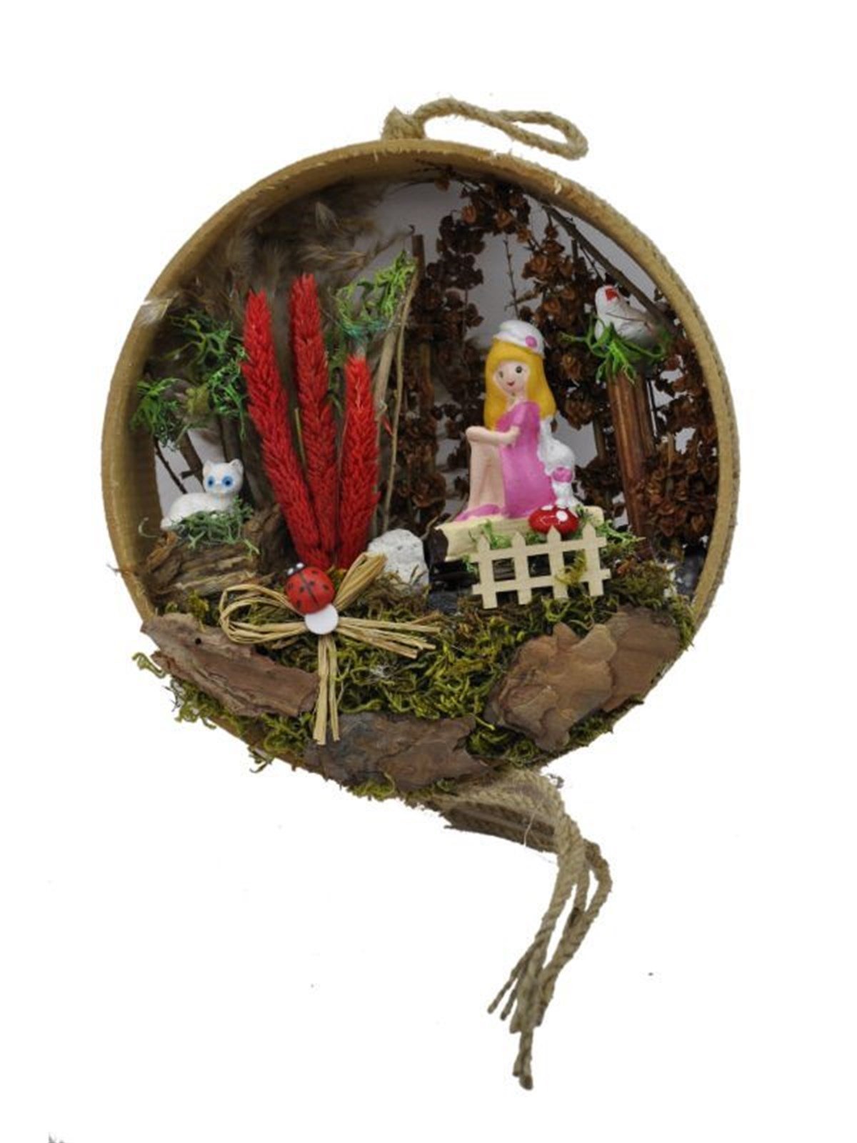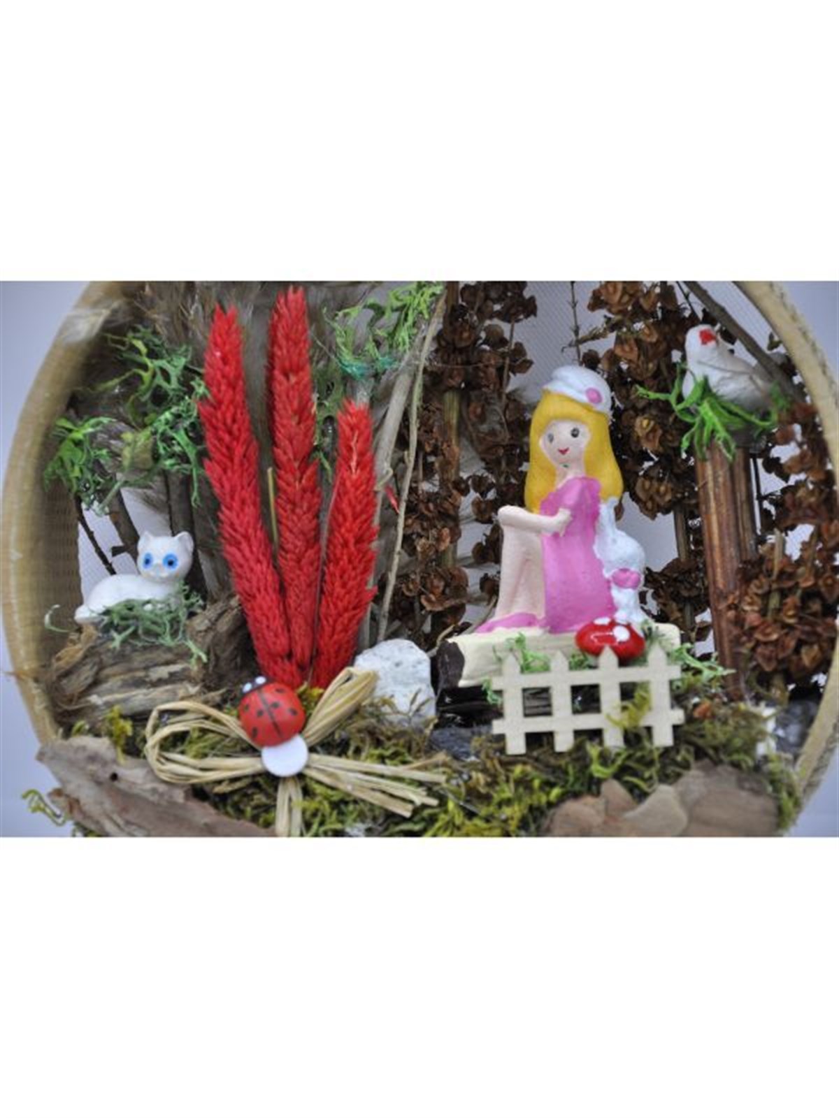 çit,gelincik,mantar figürleri kozalak,şoklanmış yosun,taş,ağaç kabukları,kurutulmuş bitkiler ve jut ip kullanılmıştır.Bereket sembolü elek içerisinde tasarlanmış ürünümüz,ev-ofis ortamı için ideal olup,bakım gerektirmez