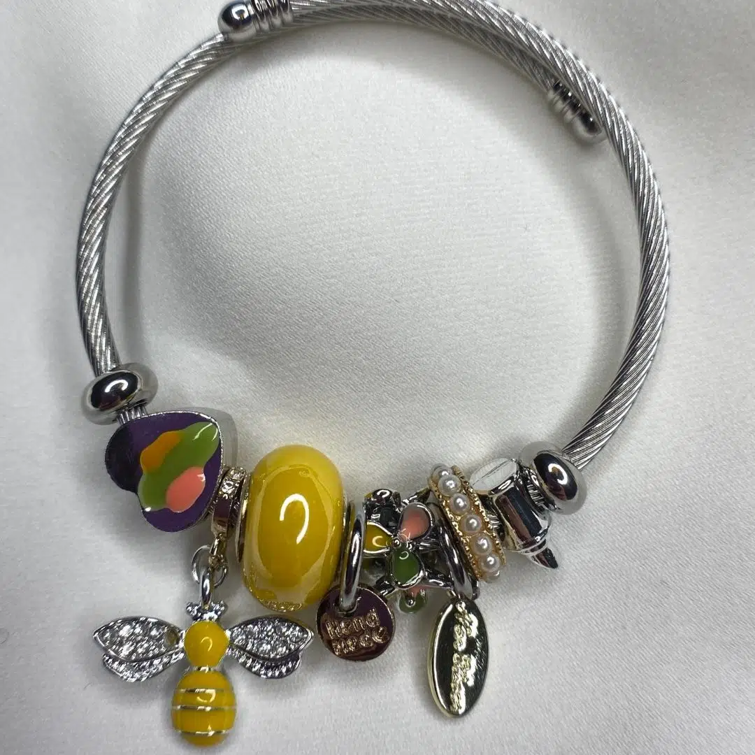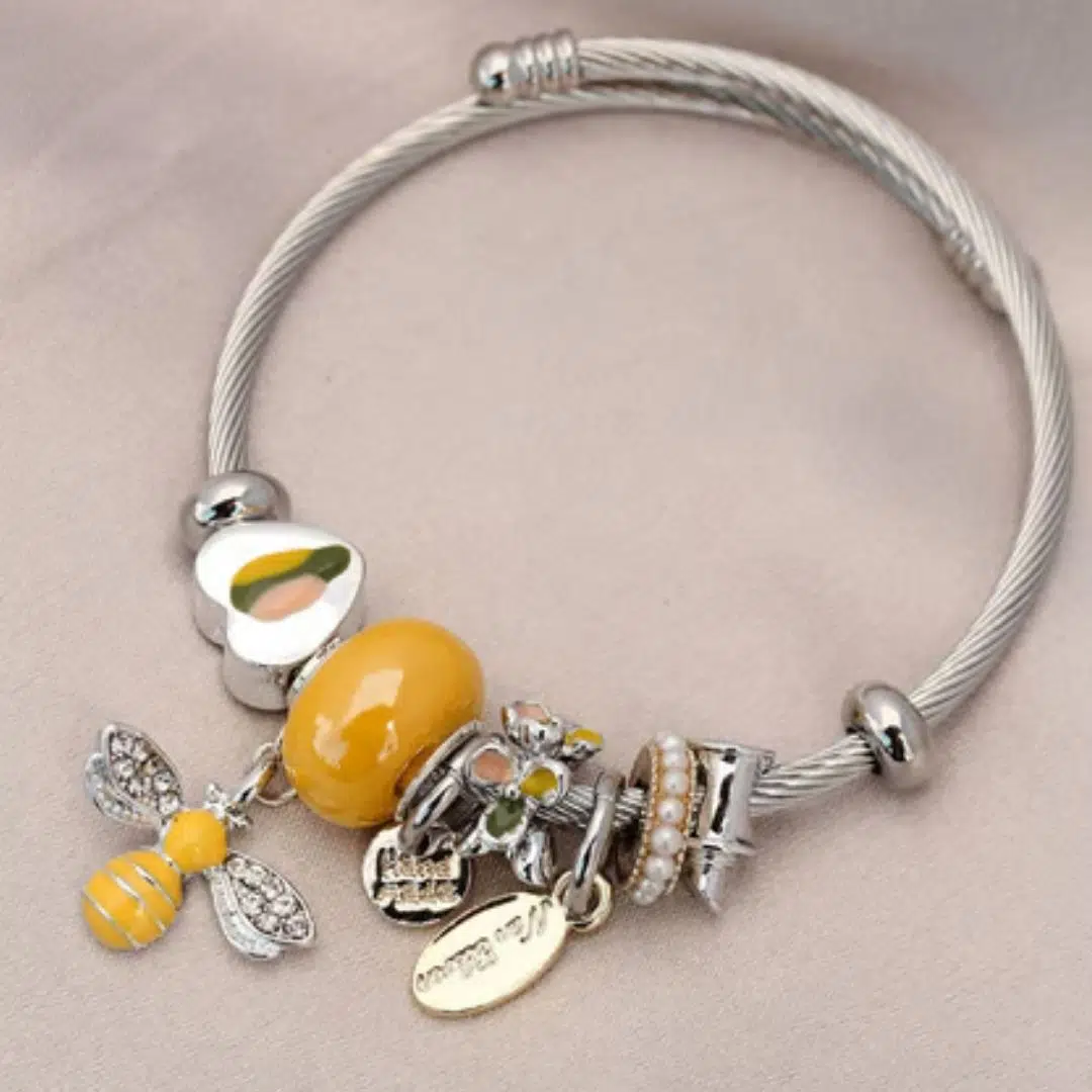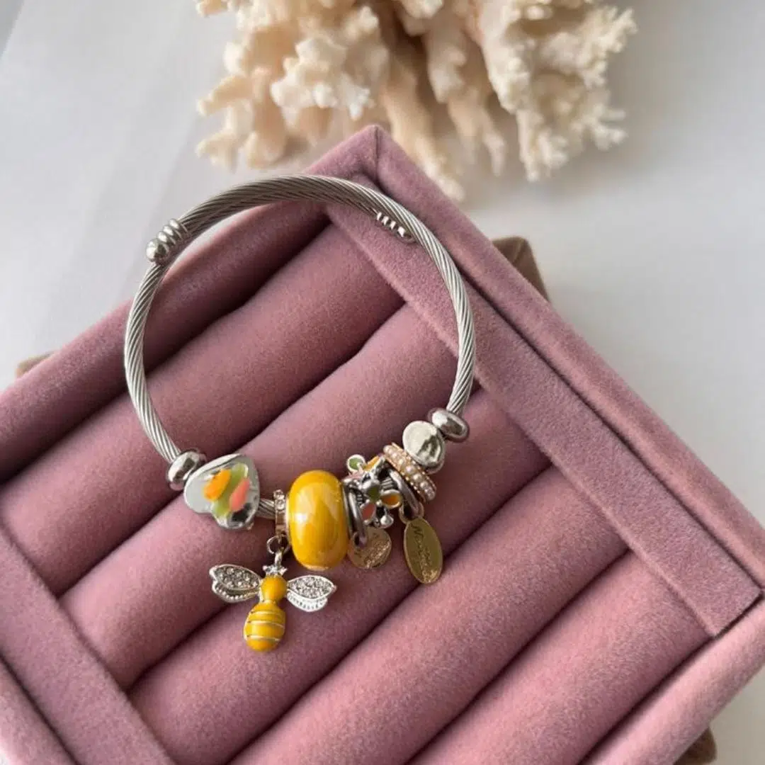 Sarı tonlardaki boncuk ve sevimli arı figürlü charm detayları, bilekliğe enerjik ve feminen bir hava katar. Kablo formundaki çelik yapısı, bilekte estetik bir duruş sağlarken sağlam kilit sistemi güvenli kullanım imkânı sunar. Alerji yapmayan yapısı sayesinde hassas ciltler için de uygundur.