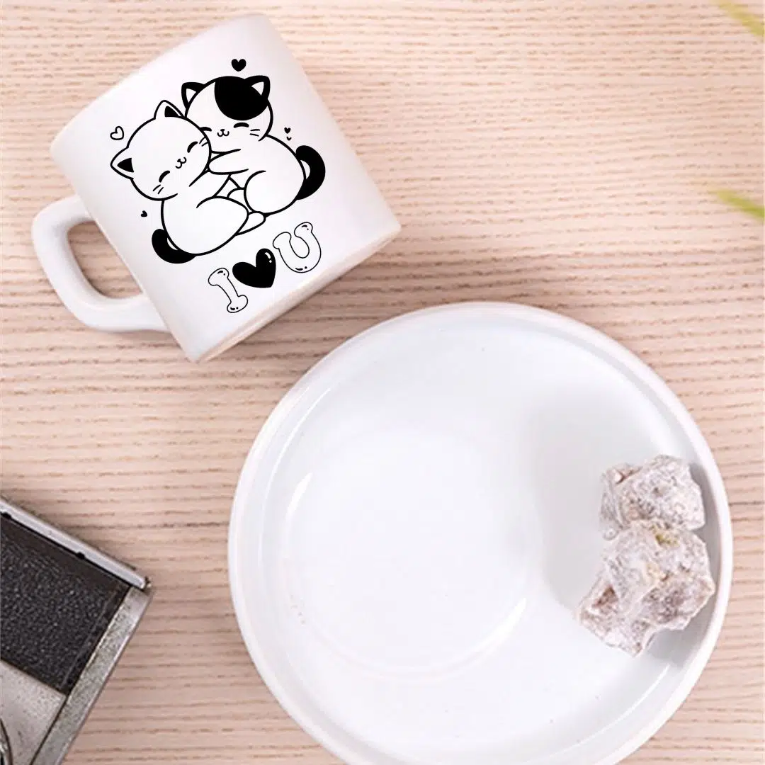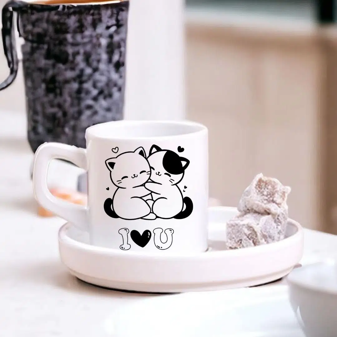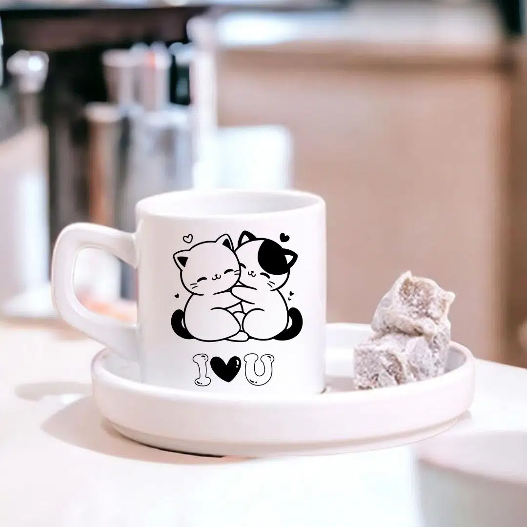 Aşkın en tatlı hâlini yansıtan Sevimli Çift Kedili I Love U Türk Kahve Fincanı, romantik tasarımıyla kahve keyfini daha özel hale getiriyor. Üzerindeki sarılan iki kedi figürü ve “I ❤️ U” detayı sayesinde hem anlamlı hem de şirin bir görünüm sunar.