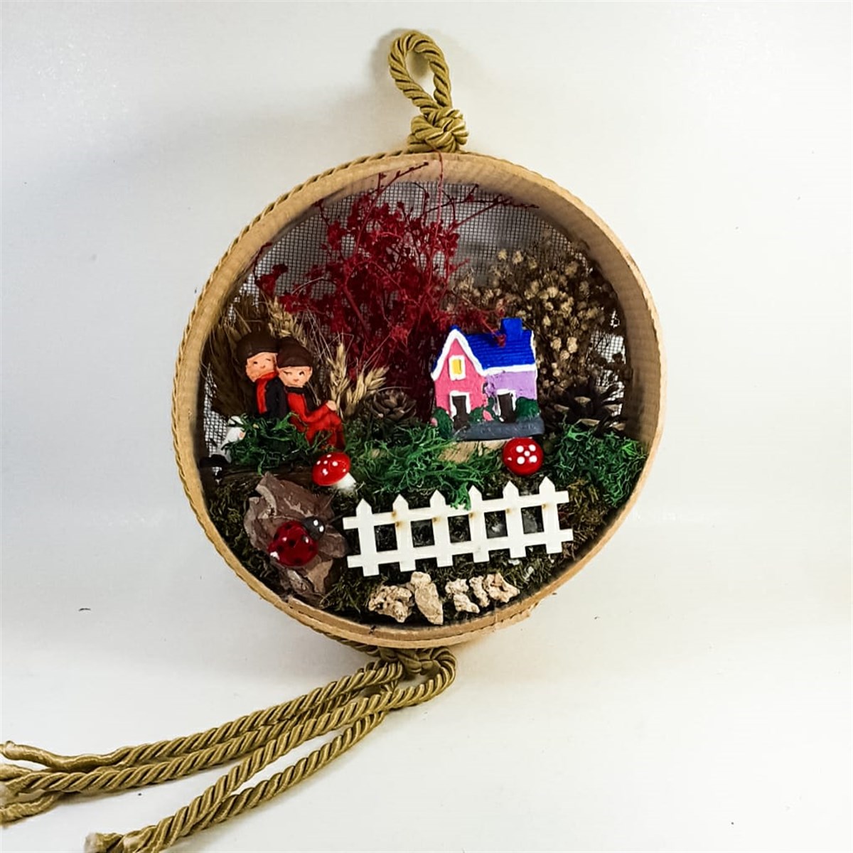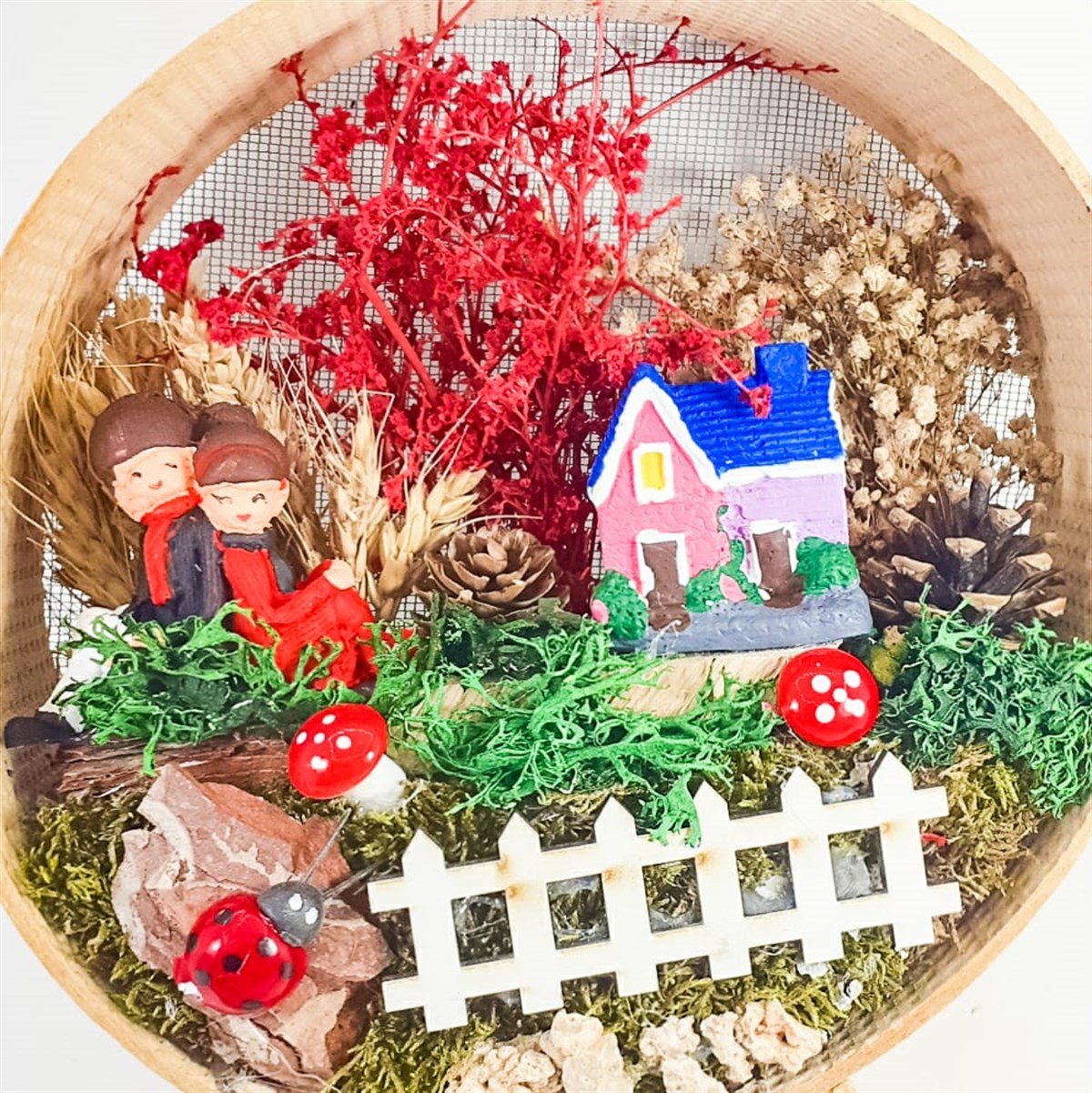 Kız-Erkek çift,ev,köpek,kedi bibloları yanısıra ahşap çit,gelincik,mantar figürleri kozalak,şoklanmış yosun,taş,ağaç kabukları,kurutulmuş bitkiler ve jut ip kullanılmıştır.Bereket sembolü elek içerisinde tasarlanmış ürünümüz,ev-ofis ortamı için ideal olup,bakım gerektirmez