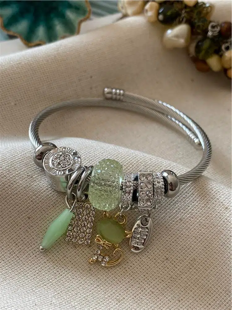 Yeşil Taş Detaylı Charm Tasarım Çelik Kadın Bileklik – Modern & Şık Bilezik
